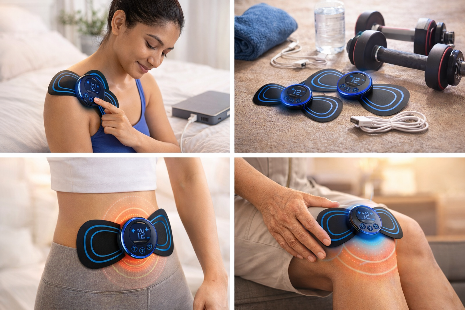 This Mini EMS/TENS Massager Pad is a powerful electric body massager for quick pain relief. It helps with neck pain, shoulder pain, and back pain relief at home. It has 8 massage modes with adjustable intensity for deep muscle relaxation. This portable USB rechargeable massager is perfect for daily stress and tired muscles. Use it on neck, back, waist, arms, and legs anytime.